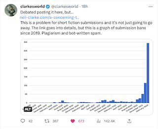 But this, from Clarksworld, hits home. Essentially places that didn't have that much spam (when I was an editor at ABP there was plenty of spam, but it was the kind that was so bad you could tell) are being hit hard now. This is in the digital space, but perhaps it could hit the real space too. I'm thinking art printed then sold or perhaps even someone claiming to find a lost manuscript of a famous author (written in the exact style of that author by AI)... though on the latter I suppose we rarely see forgeries anymore, do we?