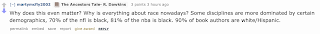 I just posted a set of replies that sound like all the replies that would have existed back in 2000, when I was coming of age. If you follow or know me, you'll know that I was more conservative in my younger days. That young man had joined the army. And though it took some time, I eventually came around. These replies, though, mimic the exact replies people always gave to accusations that any industry was racist. Their point was that either it couldn't be or that since it was heavily white it was because that was the natural hierarchy (that's rarely stated, but it's implied). Right. Of course, there's the usually canard of NBA or NFL being heavily black and let's take that away (why always bring sports into it? When even a cursory look at its history can show you what happened)?