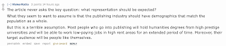 Now, I'll also say that the article is incomplete and I would like to have an analysis look at indie publishing (and sales on amazon etc) as well as web fiction web novels and the like to confirm what I think: that minority writers do go to other places when they know they're not welcomed in certain places. See the instapoets, for example. How the bestselling poet of the past century or so has been treated by mainstream publishing is not a matter of "she went rogue" but a matter of being kept inter place by a mostly white industry, IMO. Your thoughts?