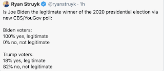 Note, as before there is no both sides to this. 82% of trump voters believe Biden isn't legitimate. All because minorities voted for him. Think on this level of crazy. And with the right, where the grift starts (Trump asking for $ that will mainly go to his campaign) and the crazy true believers start is so fuzzy a line that it isn't worth making.
