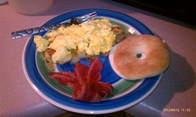 I was craving eggs pretty badly this morning, which is rare, so I got my butt up and went to Kroger. I decided to try the "Break-free" egg substitute instead of regular eggs and was pleasantly surprised!! It was actually really good. Instead of getting hash browns, I made my own variation and that turned out really good, too. All in all, I was able to put together a complete breakfast for 563 calories. The only thing missing was fruit, but that's because I'm going to have some for a snack later :). Here's my recipe: