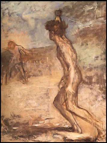 The rays of the sun are painting the opposite ridge, there at the top of the valley, with warm yellows, glittering golds. But they reach only halfway down, way short of the bluish mist that is still blanketing the bottom of the valley. Here, under this cover, it is an eerie sight. One cloud of murk after another drift aimlessly in the air. In the thick haze I step among rocks and bodies, barely noting the difference between one immobile shape and another. I am finding my way by touch rather than by vision. All the while I am grateful, so grateful that the vultures are nowhere in sight. In the distance I spot an outline of a dog here, a dog there, sniffing the remains with their tails between their legs. And for the first time in my life I pray for help. I look up the slope searching, hoping for something divine, something that will guide me, show me the path out of this dark passage. I cry out to God, bless me, sustain me, protect me... You are the only shield I have against my foes, the shadow by my right hand. Now I hear the babbling of a brook, and before long I am sloshing my way through it. This must be the border, the natural border between us and the Philistines. From here on I am encroaching on the turf of the enemy. I stop to choose five pebbles from the brook. Four of them I put in my pouch, and one in the knot of my sling. My wrist is ready. I peer through the mist, listening intently for the voice of the Philistine.“Coward,” he howls, and his voice rattles me. It sounds so close that for a second, I am stunned.It is then that rays of light finger the mist, first with some hesitation. Then with a rip, they pierce through it, and are now shining directly upon him. His heavy ankles, covered with bronze leg armors, are planted slightly above the level of my eyes, on a ledge up there, at the opposite side. As the light becomes sharper, so does his shadow. With a steep slant, it is cascading over the limestone outcrops. There is Goliath, overshadowing me.