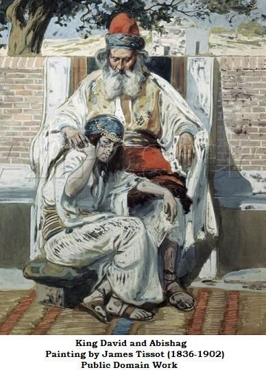 The second painting is by James Tissot, depicting David as a fatherly figure, caring for the young woman, Abishag, who has been brought to the palace to keep him warm.