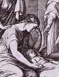 This particular illustration, Showing Bathsheba agonizing over her dying baby, has always amazed me because of this question: How did the artist manage to make the baby look sick? When drawing a baby, the cuteness gets in the way of showing anything else but hope and promise. I had to look closer, which is when I discovered that the artist used light, that cuts across the baby's cheek, which is equivalent to crossing him off. That idea is what I used in my description of the dying baby.