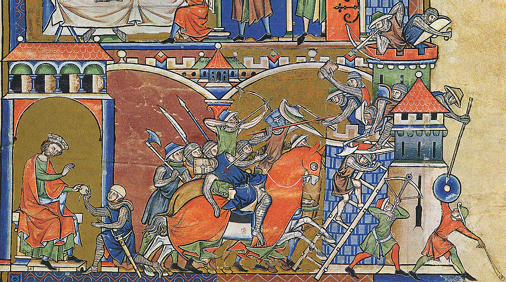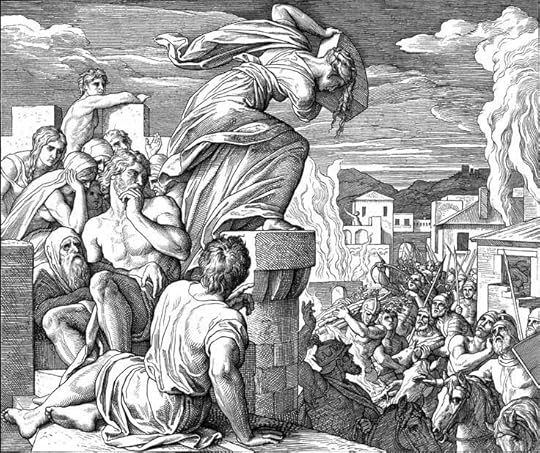 The plot to kill Uriah was perhaps based on another historical battle: the Battle of Thebez, a few generations back. During that battle, which is depicted in the second image, Abimelek led an attack on a besieged city. He fought most of the way towards the tower, then drew too close to its wall. And then, a woman on a high point of it dropped a millstone upon his head. The blow cracked his skull—but unfortunately, didn’t kill him. He called his young armor-bearer, and asked him to draw his sword and run it through him, so no one would know, no one would laugh at him, as his demise had happened not by crossing swords with a mighty soldier, but by the soft hand of a woman.