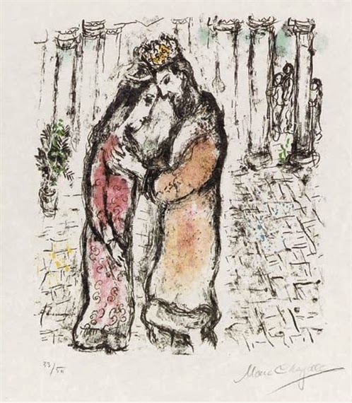 Marc Chagall said, "Will God or someone else give me the strength to breathe the breath of prayer and mourning into my paintings, the breath of prayer for redemption and resurrection?" And indeed, in his painting he expresses great devotion, a love that is meant to be. David and Bathsheba face each other, heads touching, he caresses her shoulder as if to comfort her.
