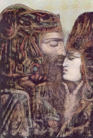 Ernst Fuchs (born 1930) is an Austrian painter, draftsman, printmaker, sculptor, architect, stage designer, composer, poet, singer and one of the founders of the Vienna School of Fantastic Realism. Here, too, David and Bathsheba face each other, they meld together in the heat of passion, David taking over nearly the entire space, and her as well. The scene is depicted in an exotic manner, and modeled after Egyptian wall paintings.