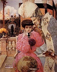 Gustav Adolf Mossa ((born 1883) is a French Symbolist painter. He depicts the relationship as one of decadence, and describes the lovers in French attire. There is an age difference between the two, and their conversation is depicted as sharing a hushed secret.