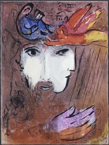 I try to take control of my desire by playing my lyre and writing poetry, but notes and words fail me. Everything I compose these days seems to be but a pale shadow of a shadow of what Bathsheba means to me. And the one image that keeps coming back to me is our reflection in the glass, where our faces melded into one. My eye, her eye, and around us, the outline of a new, fluid identity. A portrait of our love, rippling there, across the surface of the wine.This was inspired by this painting of David and Bathsheba, by Chagall. In my future posts I will give you many other art pieces, modern and old, that informed my story.