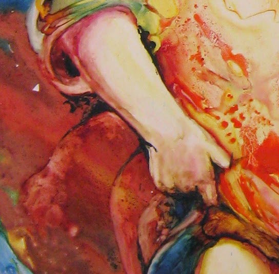 I strive to maintain a sculptural feel for Bathsheba, but take the freedom to play with a splash of colors, so as to draw contrasts between cool and warm hues. I create a variety of textures, using a loose, spontaneous brushstroke. This I achieve by applying puddles of pigments over Yupo paper, which (unlike traditional watercolor paper) is non-absorbent. I let these puddles drip in some places, and in other places, I lift and shape them into careful designs, using various tools.