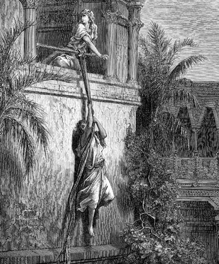 When Saul sends assassins to kill David, Michal helps him escape from her bedroom window. This story has fascinated artists throughout the ages. To illustrate the variety of viewpoints, here are the works of two of them. While Gustave Dore emphasizes drama, danger, and heroism, it is the possibility of love that Shagal chooses to focus on. His Michal stands there with open arms, while David floats out into a starry, moonlit sky.