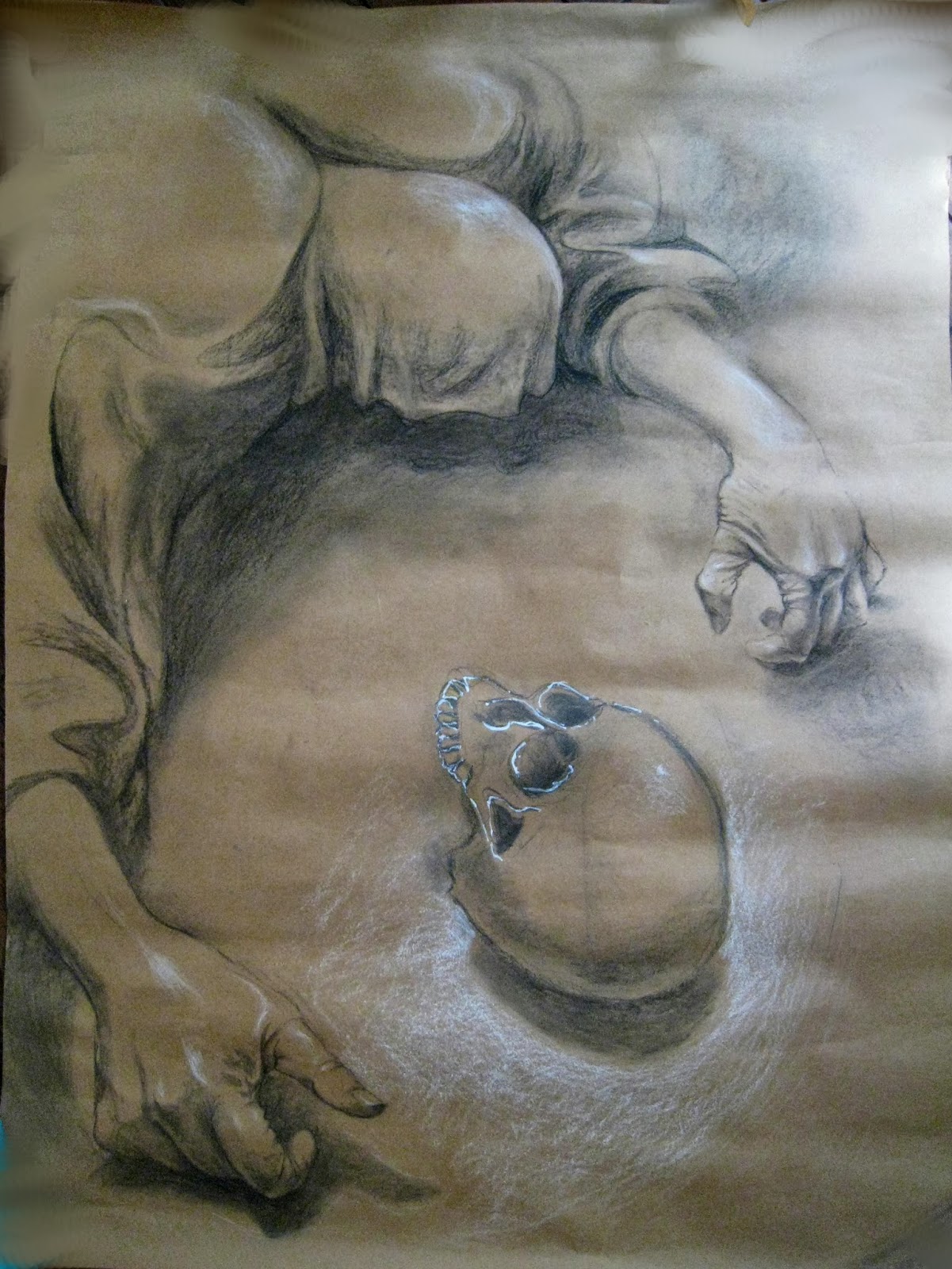 My chalk and charcoal drawing on brown paper of a creature in hell