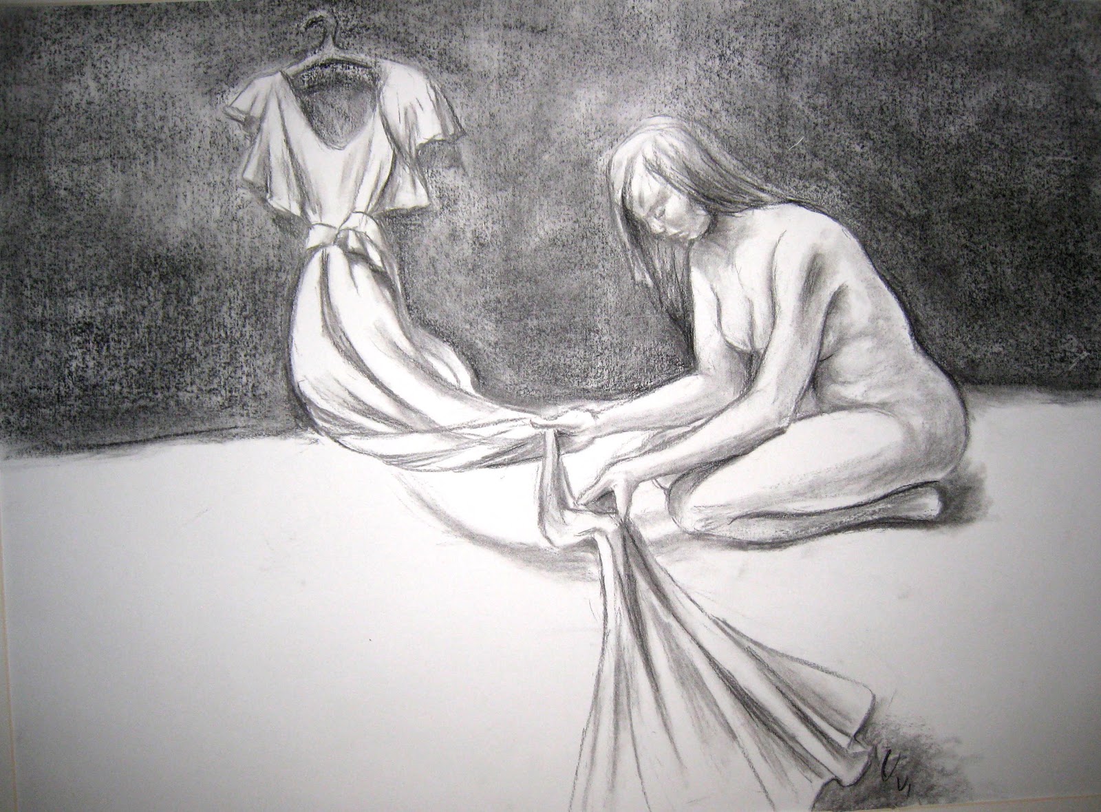 This is my charcoal drawing titled The Wedding Dress, inspired by the sight of a wedding dress that a friend of mine inherited from her mother. In it I contrast the loveliness of the dress, and all the dreams it invokes, with the nakedness of the figure, who at this point is left without illusions.