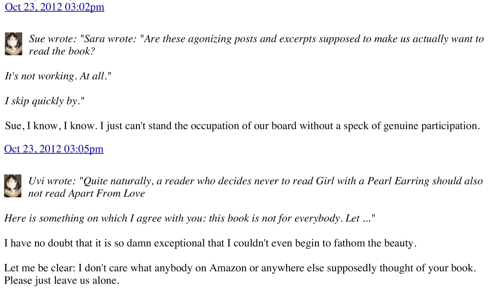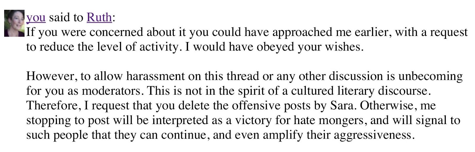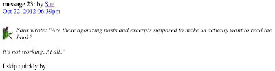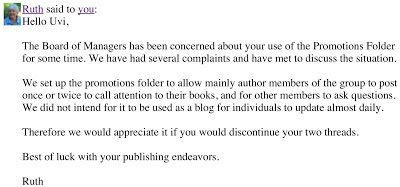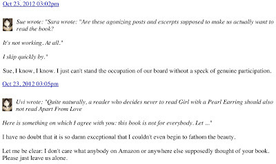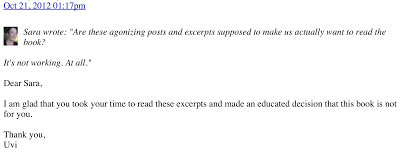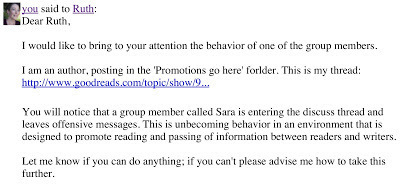 As part of my reaching out to readers I post on a thread in Promotions Go Here, which belongs to a group called Constant Reader on Goodreads (a social network for reading books.) In the last few days a group member calling herself Sara (with no public profile to her name) decided to do her best to shut me off. After she had written that my 'annoying posts and excerpts' are 'not working' to make her read the book, I replied that I'm glad she came in, read my posts, and made an educated decision that the book was not for her. I truly meant it.