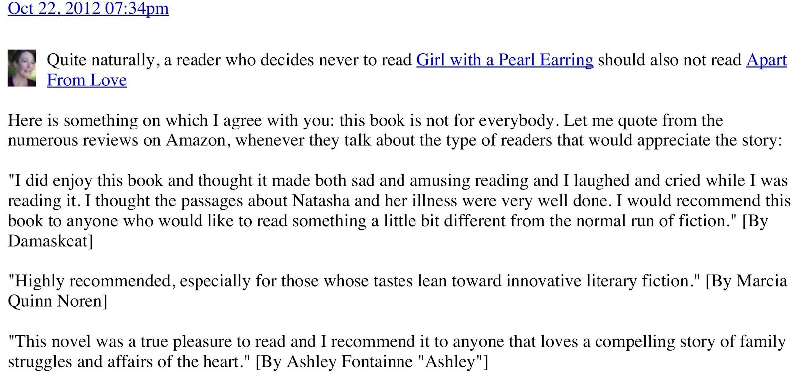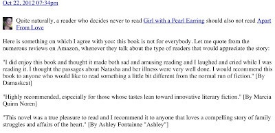 In reply to which I stated that Apart From Love is not for everyone, and went on to quote several of my reviewers who had defined what kind of readers it is meant for.