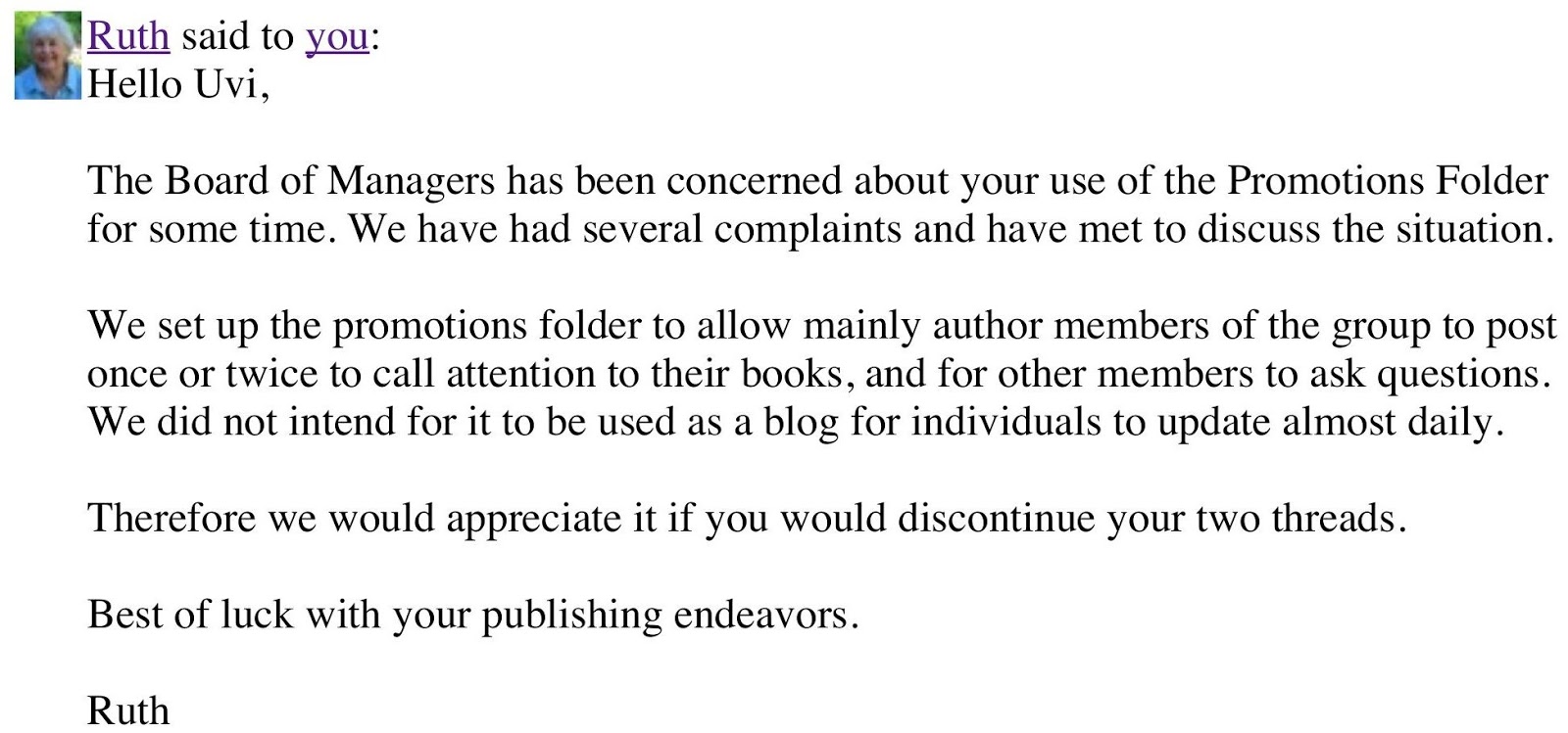 Which forced me to call the principal (Ruth is a moderators of this group.)
