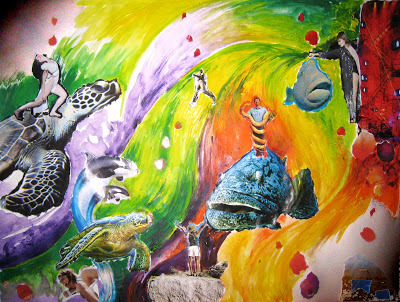 This is a mixed-media painting with a few collaged pieces