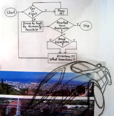StartCar in front? If Yes, Pass it. Then go back to step 2.If No, drive as fast as humanly possible.Reached your destination? If Yes, Stop.If No, ask yourself, Need directions?Regardless of the answer--Yes or No--charge ahead saying, Directions? What Directions? And go to step 2.