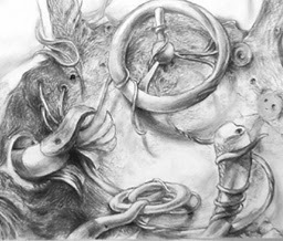 This image of the snake crawling forth to lay its claim upon the victim (who knows his fate and yet denies it) is still with me. This is, perhaps, the reason I hinted at it in a detail you can find at the bottom of my charcoal drawing, The Place Where I Played. Waiting there for me is the snake, ready to sting when while I am idling, yearning for what is gone, yearning for what I wish to have happened.