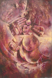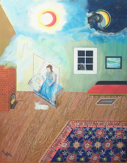 Later in his life, when left alone in this space, my father painted it and through the walls he connected it to the memory of his childhood home. You can see the same red sofa, the framed landscape, the Persian rug... But not a living soul. The place is empty, and he filled it but conjuring the image of his mother rocking the cradle.