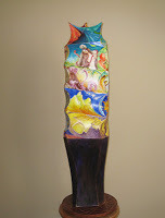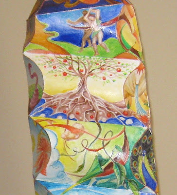 The sculpture is constructed from three parts: The foot at the bottom, which I shaped as an elegant, curvy pedestal The faceted design in the middle, which I created out of a single sheet of paper, with no cutting or glueing at all (merely by light scoring and hand pressure)And the multi-pointed crown at the top, where the eye of God looking down on the tumult is painted (not visible here.) On each facet of the sculpture, I painted a different scene from the creation of the world. The lines of the design in one scene curve onto the next facet, the next scene. For example, the branches of the tree of knowledge rise into the top facet where the become the outline of the road leading away from the garden of Eden.