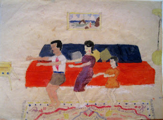 Here we are, my father, mother and I, dancing the Twist (or at least, learning to do so) in unison. In the left corner you can spot the radio (set on an end table); in the right corner is a hanging lamp, on the wall over our head is a framed landscape, under our feet is a beautiful persian rug, the pillows on the red sofa seem to dance as well, or at least they are balanced on a point... And most importantly, all three of us are feeling the same beat. This, to me, is not just a picture of home; it is a picture of happiness. It is what was lost in later years, when my parents separated.