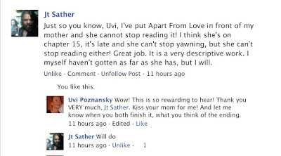 There are 34 eloquent, beautiful reviews on Amazon for my novel Apart From Love, but I have just received the one I consider the most rewarding of all! Check it out; this is why a writer writes: