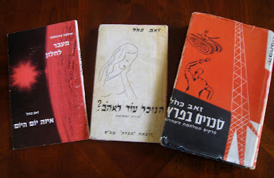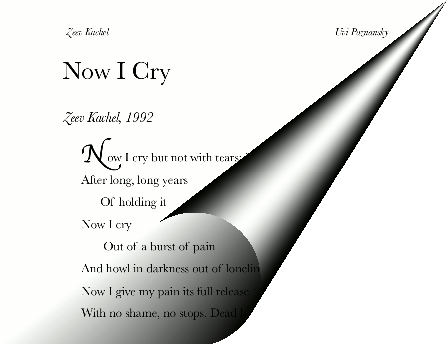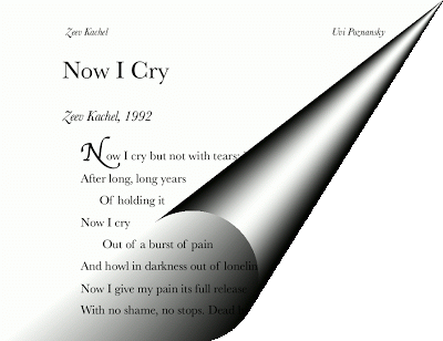 The even-numbered pages of the book bear the names of the writers (my father's name, Zeev Kachel, and mine.) To eliminate confusion, the first half of the book contains my creations, the second half--his, and I credit the writer under each individual piece, as you can see in these two pages.)