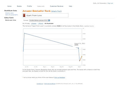 Last time I promoted the Kindle edition of Apart From Love, the book has reached its place among the top 100 on Amazon Bestseller Rank list for free books. In fact, it reached #85 on that list, which to me seems nothing less than amazing! Or perhaps, it was beginners luck... In addition, the book was ranked #6 in Kindle Store > Kindle eBooks > Fiction > Contemporary Fiction. So I was hoping that this time around, it would reach even higher.