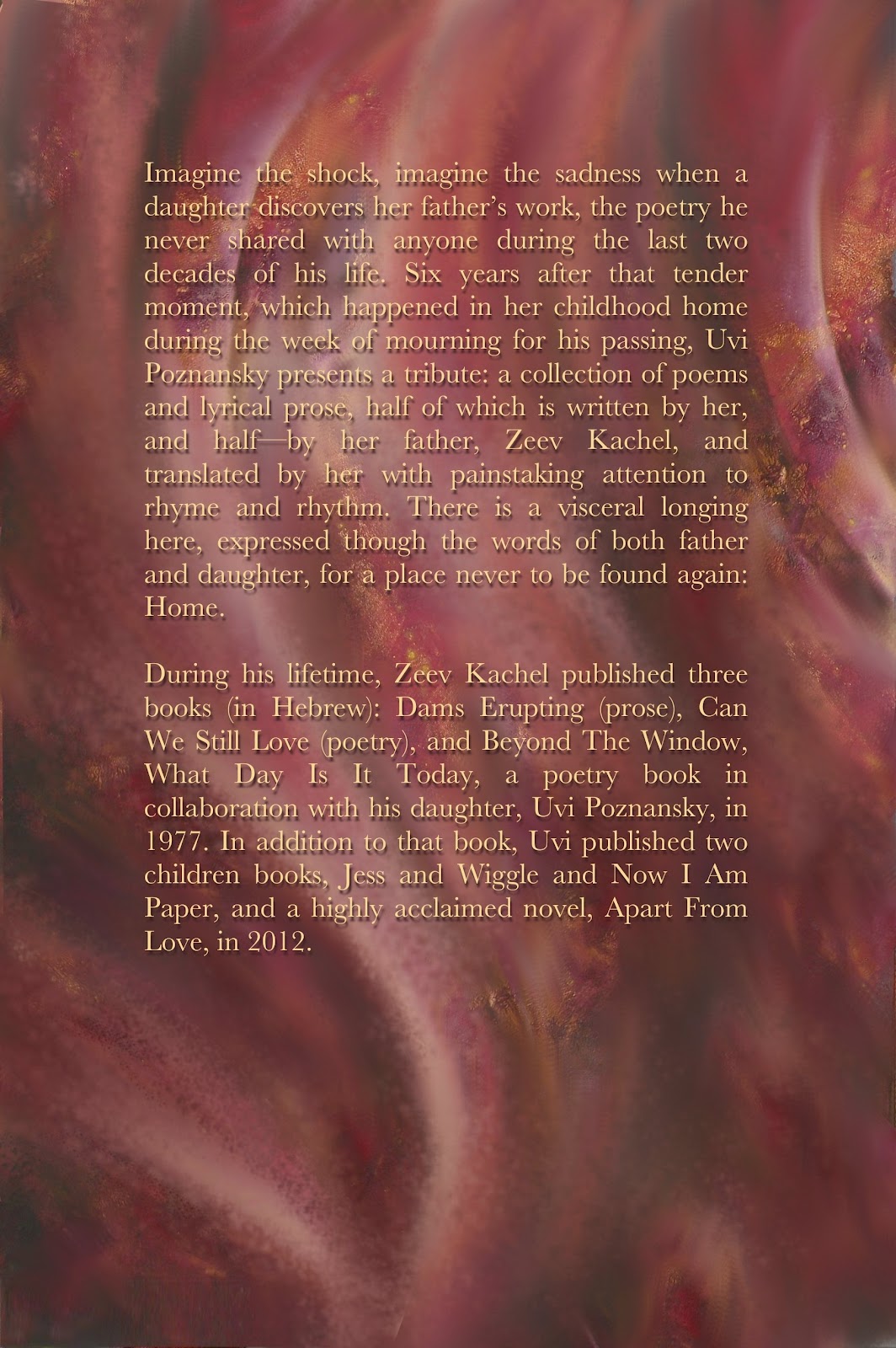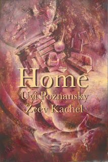 At last I found one version that looked fine to me. First I had to fit the image to a prescribed size (according the book size I have in mind.) Then I created the shadows of the lettering. You may notice that the shadow's color is not black, but rather it is the darkest purple of the painting (which can be seen in the lower left corner.) Also, I blurred these shadows, so they do not have hard edges, but fuzzy ones. Then I selected a soft yellow, with which I typed the title, Home; and a less bright version of this yellow, with which I typed my name and my father's. Being brighter, the title 'comes forward' in relationship to the author names.