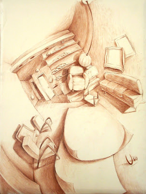 Coming back to the states, I recreated that sketch from memory. In my new drawing I used a fish-eye perspective. What does that mean? Like regular perspective, the horizontal lines converge into a vantage point in the distance. But--here is the difference--the vertical lines are not straight, nor are the parallel. As you look up, vertical lines converge to a point up there, beyond the edge of the paper. You can call it Heaven. And as you look down, the vertical lines converge to a point below, call it Hell. Which makes the entire perspective embrace you, as if you are in the middle of a fish bowl, seeing the world curve around you.