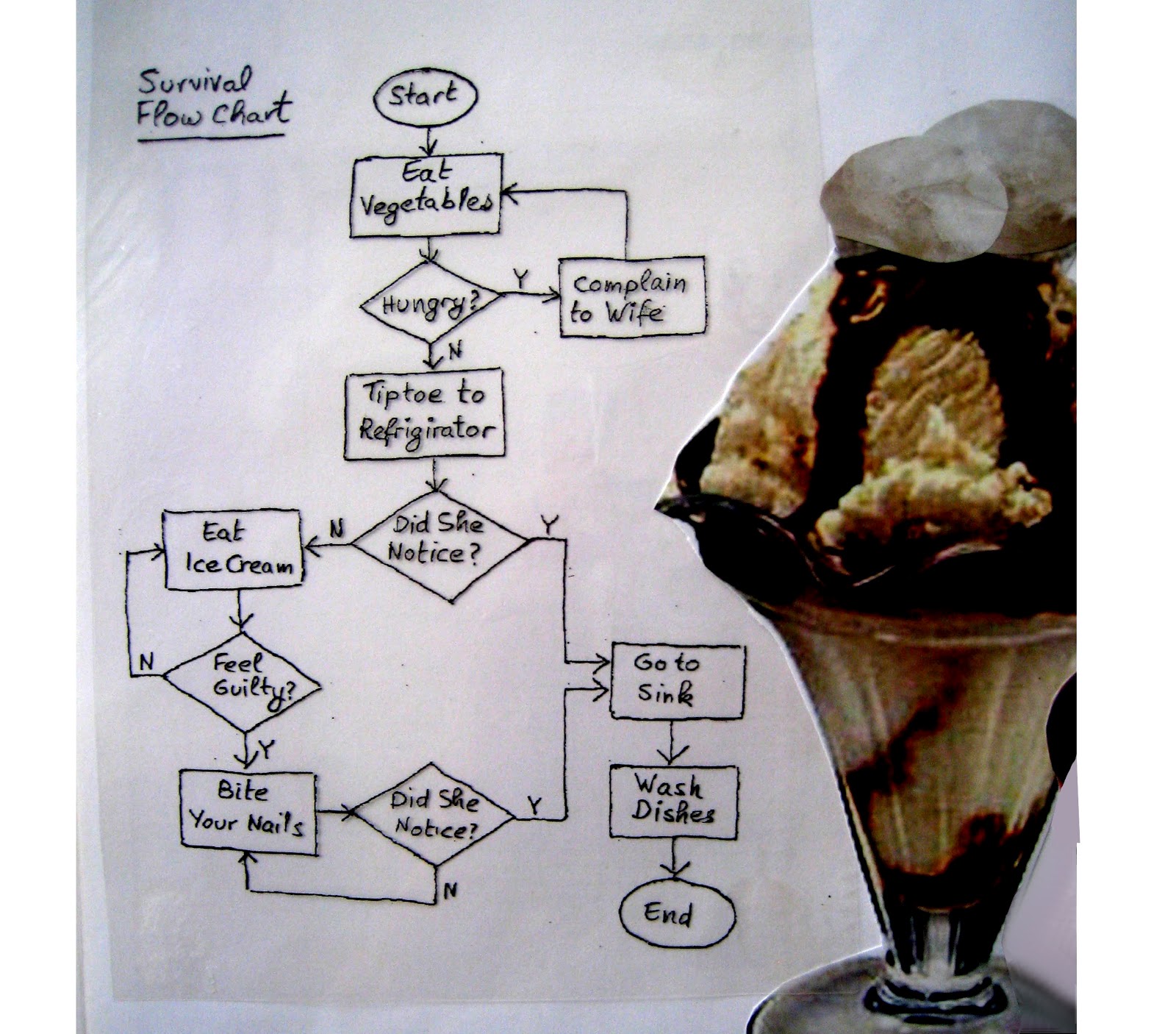 Start.Eat vegetables. (That's all you'll get from her, for breakfast.)Hungry? If Yes, complain to Wife, and she'll tell you: go back to step 2.If No, tiptoe to the refrigerator.Did she notice? If Yes, change direction: go to the sink, wash dishes, end.If No, eat ice cream.Feel guilty? If No, Go back to step 6.If Yes, bite your fingernails.Did she notice? If No, go back to step 8, until she does. If Yes, make amends: go to the sink, wash dishes, end.