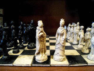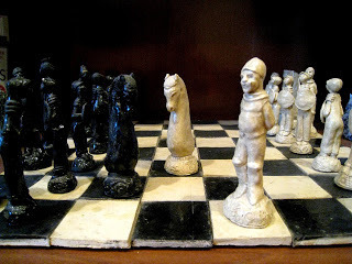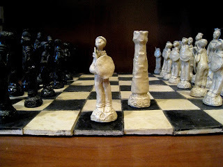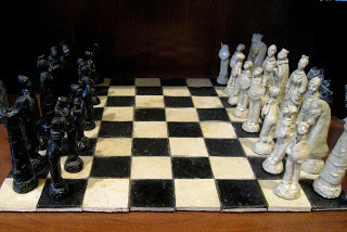 Yesterday I posted And Now for Something Completely Different, which showed the ice cream cake I made with Marzipan chess pieces on top. Today, to continue the same theme, I present a chess set I made out of clay some years back. Don't expect any 'regularity' in these pieces: one pawn is not exactly the same as another, as each was sculpted (rather than molded) individually. This, I believe, is the charm of the set.