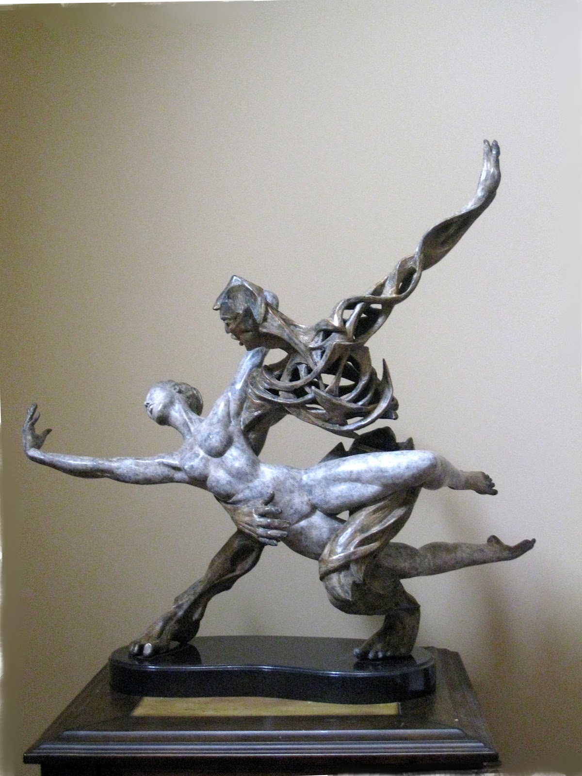 The beauty of ballet is how effortlessly the dancers seems to soar in the air. So in one sense, this verse (and the bronze sculpture inspired by it) is about the illusion presented to us by bounds and leaps, by the ingenious choreography and the virtuosity of the dancers. But in a larger sense, this verse is about the way we relate to one another. Can she take flight without the support he offers--or else, is it his hold that holds her back?
