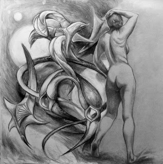 This is a charcoal on paper two-piece composition, attempting to combine two drawings, which I have posted here before: the first in a post called Seaweed as a Source of Inspiration, the second in a post called The First Time She Laid Eyes on Him. The reason I find composition so challenging here is because each one of the original drawings occupied the center of the paper, and so both of them would be fighting to remain the focus of attention.