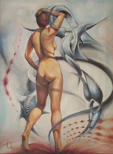The underpinning of this painting is the idea that you cannot immediately resolve which is the foreground, which the background. Who is dreaming whom? Is the woman imagining the strange sea-creature, or is he imagining her? They appear head to head, but neither one is solid. Each one of them is half-transparent, allowing the outlines of the other one to shine through its own body.