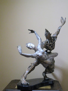The sculpture takes this ambiguity to an ultimate extreme, because as you may notice, the body of the male dancer is entirely porous, and worse--it is disconnected: The torso is completely separate from the hips, it hovers in space in utter discontinuity! You, the viewer, are invited to 'connect the dots'... It is, in fact, her body that holds him--not the other way around. If not for her, his upper body would be in pieces on the floor...