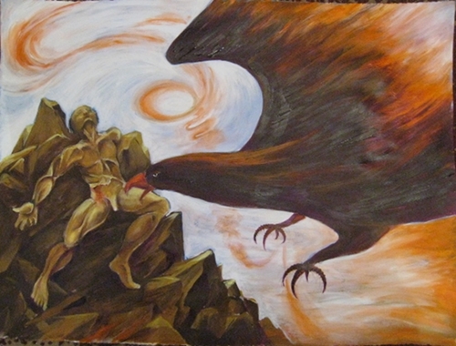 The Minotaur, a creature part man, part bull, lived at the center of the Labyrinth until it was killed by Theseus. On his arrival in Crete, Ariadne fell in love with Theseus and gave him a ball of thread, so he could find his way out of the Labyrinth. She is seen above, dancing with the thread, which connects the panels together. Prometheus stole fire from the gods and gave it to mortals. He was punished by being bound to a rock while a great eagle ate his liver, only to have it grow back to be eaten again the next day. Here, the eagle itself is the blazing fire of the gods.