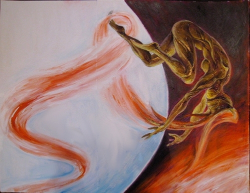Stacking the pieces vertically seemed appropriate, because my piece--a figure floating in space like Dedalus who lost his wings getting too close to the sun--lends itself to be up there above the rest. It is a metaphor for my own fragility; indeed, the fragility of all of us who dream of soaring... The middle piece, painted by Ettore Andreani, describes the plight of Prometheus, doomed for eternal suffering for daring to give fire, which is divine, to mortals. Down below, Albert Setton's piece, depicting the Minotaur in his cave, which is perhaps the way he views himself. This piece lends itself to be underground.