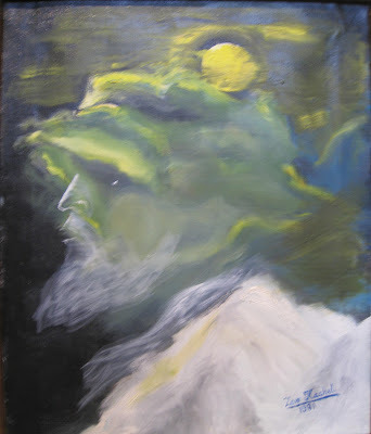 For this story, which I chose to post today, on Father's Day, I thought it appropriate to display one of my father's own oil paintings. The story of how he painted it fascinates me: He painted the slope of a mountainside, and a moon high above, then archived the painting, never taking another look at it--until, several years later, he unearthed it and asked himself: What if... What if I paint this line here (Which became the nose)...