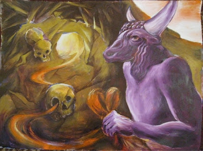 I let the Minotaur hold the end of Ariadne's thread. He knows his fate. Perhaps he is waiting, with a philosophical look of acceptance, for his slayer to come in, following the trail of blood, and the remains of all his victims. Death is imminent...