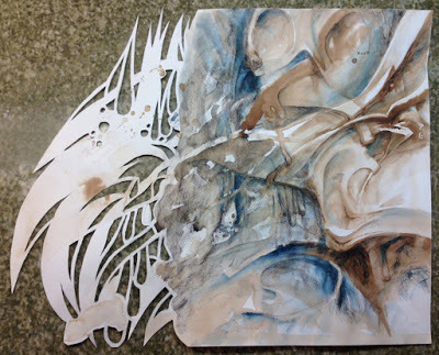 Here is an art piece I have been working on for the last couple of weeks. It started as a watercolor and went wild from there. I think of the area at the left edge of the paper as an organic extension of the painting, even though it is not painted. This part grew into shape by cutting out the paper to create a lace-like design.