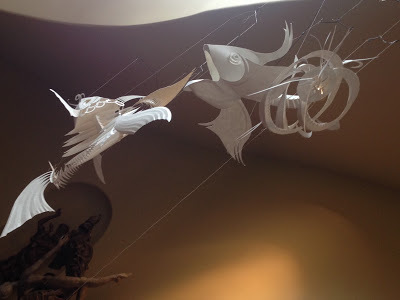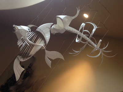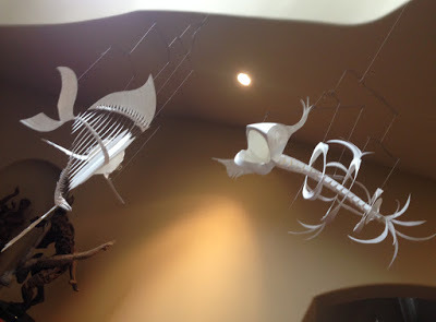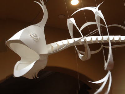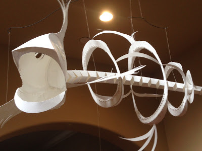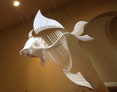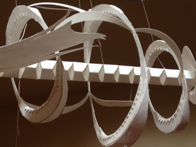 This is a second paper fish I've designed this summer, a smaller one. This time, I decided to make him look as if he's jumping through hoops, which hint at the envelope of his body. Here is a closeup of the hoops and of the vertebral column, which is designed to move flexibly left and right, nearly curling upon itself.