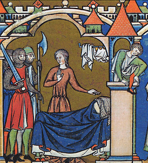 Michal fools the king's soldiers so that David can escape through the windowMaciejowski Bible