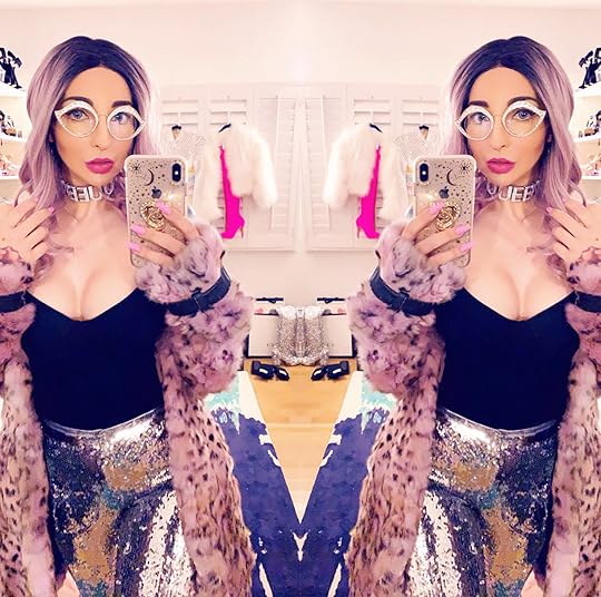 I’m in a purple wig (I buy all my wigs on Amazon by the way), gold rhinestone Gucci glasses, a black bodysuit (of course), silver sequin pants by Milly, silver chainmail ankle boots, and an insane purple leopard-print faux fur that I bought a million years ago in Australia. I remember that it absolutely did not fit in my suitcase, I think I had to wear it back to New York… But it was worth every moment.