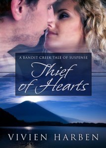 I’m bogged down in the middle of my work-in-progress, where the writing is always the most difficult. So while I resist the urge to drown my sorrows in one of those boxes of Christmas chocolates already filling the shelves, it’s time for another Bandit Creek book. Number 30 in the series is a contemporary romance titled THIEF OF HEARTS by Vivien Harben.