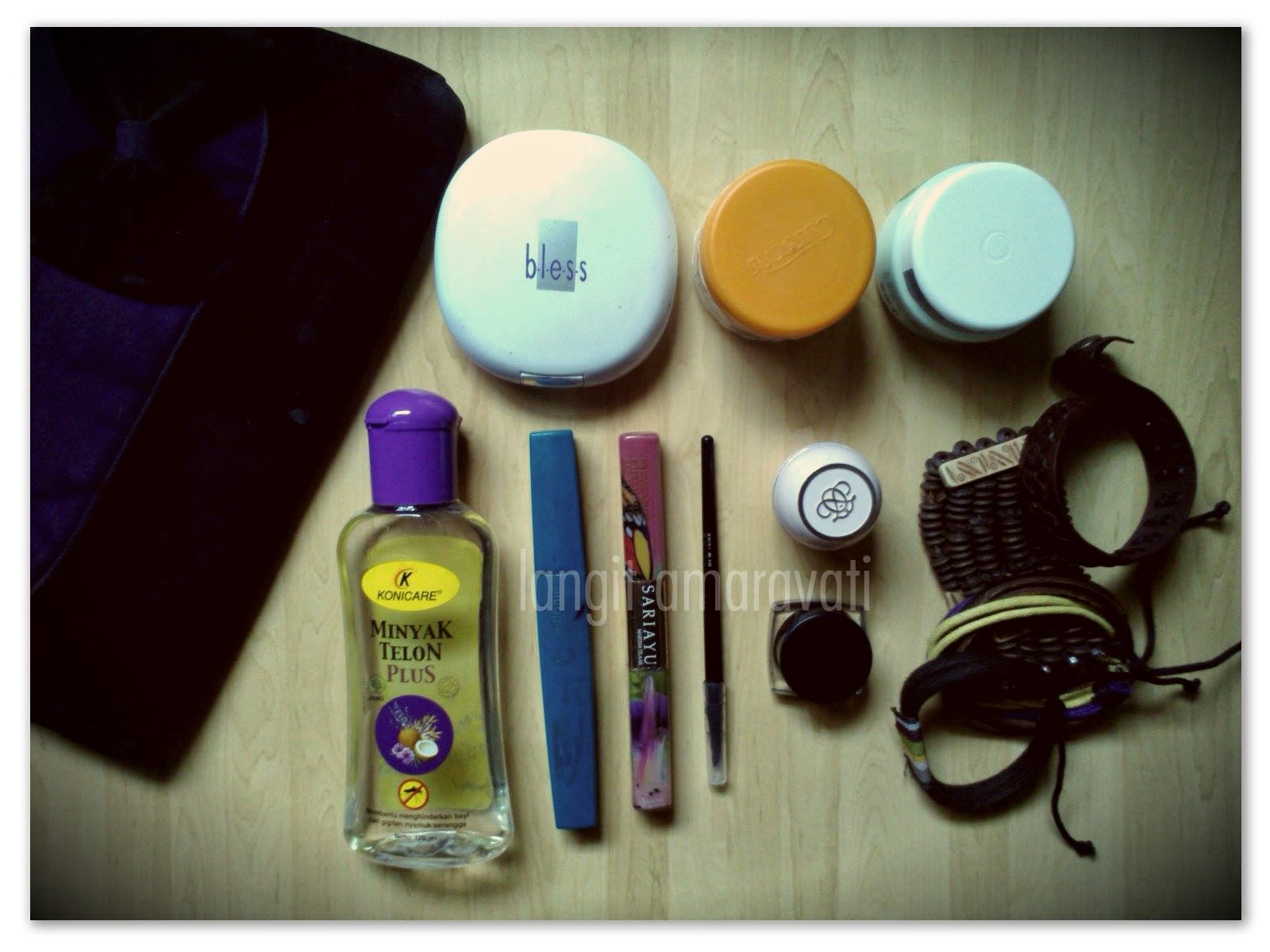 Sebagai mualaf, mohon maaf kalau isi pouch kosmetik saya berada di bawah garis mengenaskan. Seperti kata guru saya, yang penting mah usaha. Iya, nggak?