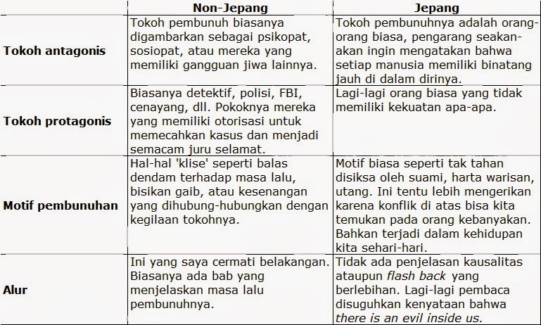 Karena sudah terlanjur membandingkan novel-novel para pengarang Jepang dengan negara lain yang menulis genre sejenis, jadi sebaiknya saya membuat semacam analisis komparasi.