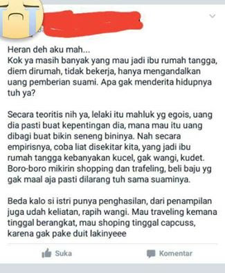 Siapa pun, perempuan yang bekerja atau tidak, bisa saja marah ketika membaca postingan seperti di atas. Saya setuju jika perempuan harus mandiri secara ekonomi, tapi tidak setuju dengan pemikiran parsial si pembuat status. Rumah tangga seseorang adalah urusan domestik dan tidak bisa digeneralisasi sedemikian rupa. Pun, dengan para ibu rumah tangga. Si penulis status mungkin belum pernah bertemu dengan ibu rumah tangga yang menjadi "ratu" meski tidak bekerja.