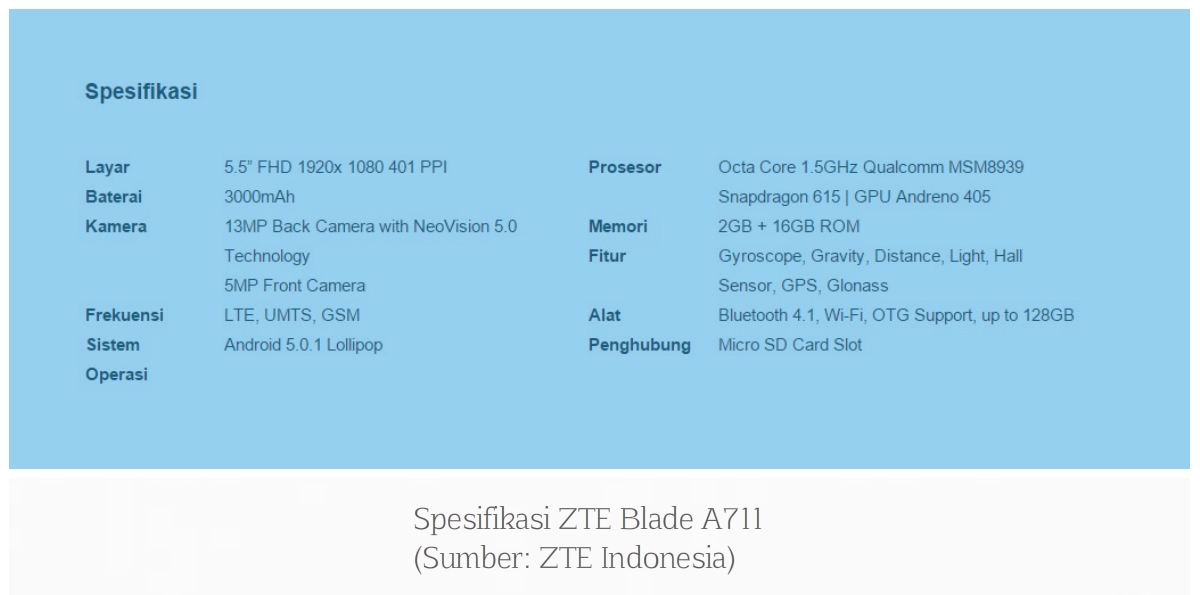 SPESIFIKASISaya yakin para pengguna smartphone hari ini begitu peduli dengan detail spesifikasi sebelum memutuskan untuk membeli, karena begitu juga dengan saya. Sebagai bahan referensi, berikut spesifikasi ZTE Blade A711: